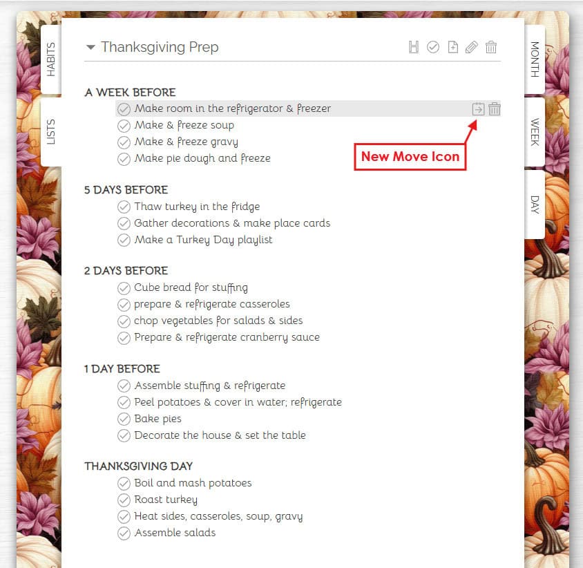 You’ll also notice an update on the Lists tab: the old clock icon has been replaced with the new snooze/move icon (a calendar with an arrow). This function lets you assign any list item to a specific task or goal box, adding even more flexibility and helping you seamlessly connect your lists to your daily planning workflow.