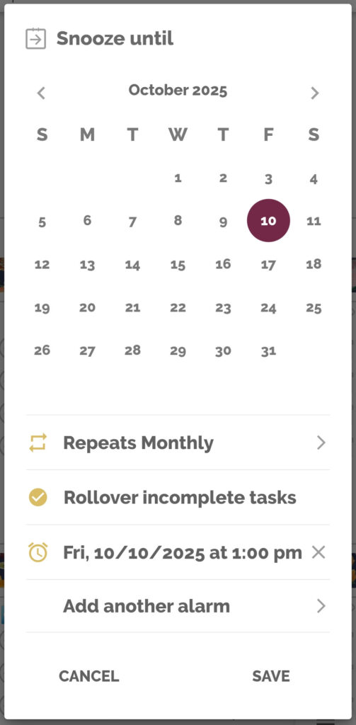 The alarm clock icon in each task box has been replaced with a gear icon, which opens the new task modal. At the very top, you’ll see our updated snooze/move icon, which is now a calendar icon instead of a clock. This section displays a mini monthly calendar with today’s date highlighted in your default calendar color. From here, you can quickly move a task or goal to another day, week, or month. - Repeat & Rollover Options: