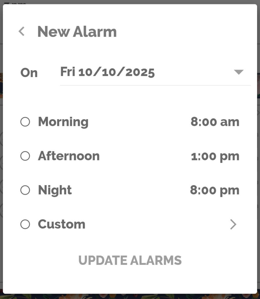 This is where the magic happens! You’ll now see a clock icon next to “Add alarm.” Tap it to open the alarm modal, where you can set default alarms for morning (8 a.m.), afternoon (1 p.m.), or night (8 p.m.). Prefer a different time? Choose “Custom” to set a push notification for whenever you like.
